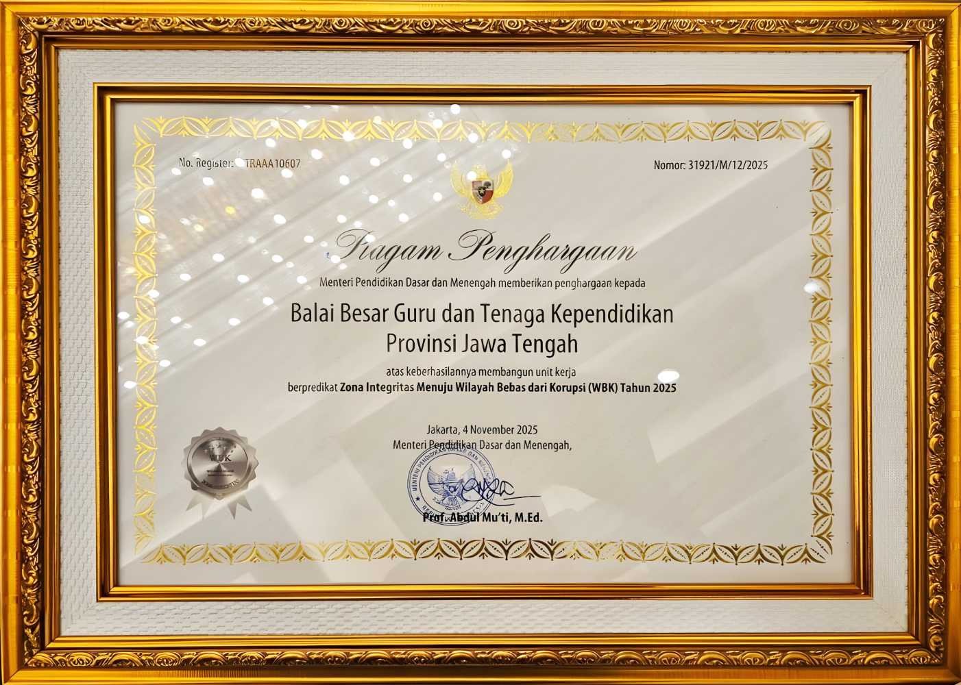 Jakarta, 9 Desember 2025 — Balai Besar Guru dan Tenaga Kependidikan (BBGTK) Jawa Tengah meraih Penghargaan Zona Integritas menuju Wilayah Bebas dari Korupsi (WBK) dari Menteri Pendidikan Dasar dan Menengah. Penghargaan tersebut diterima langsung oleh Kepala BBGTK Jawa Tengah, Darmadi, dalam perhelatan Pemberian Penghargaan ZI WBK & WBBM serta PEKPPP Mandiri Kemendikdasmen Tahun 2025 di Jakarta.